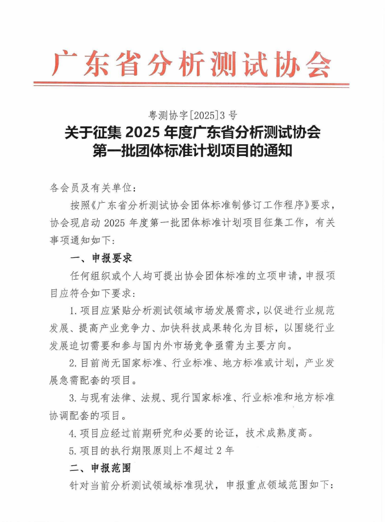 关于征集2025年度广东省分析测试协会第一批团体标准计划项目的通知