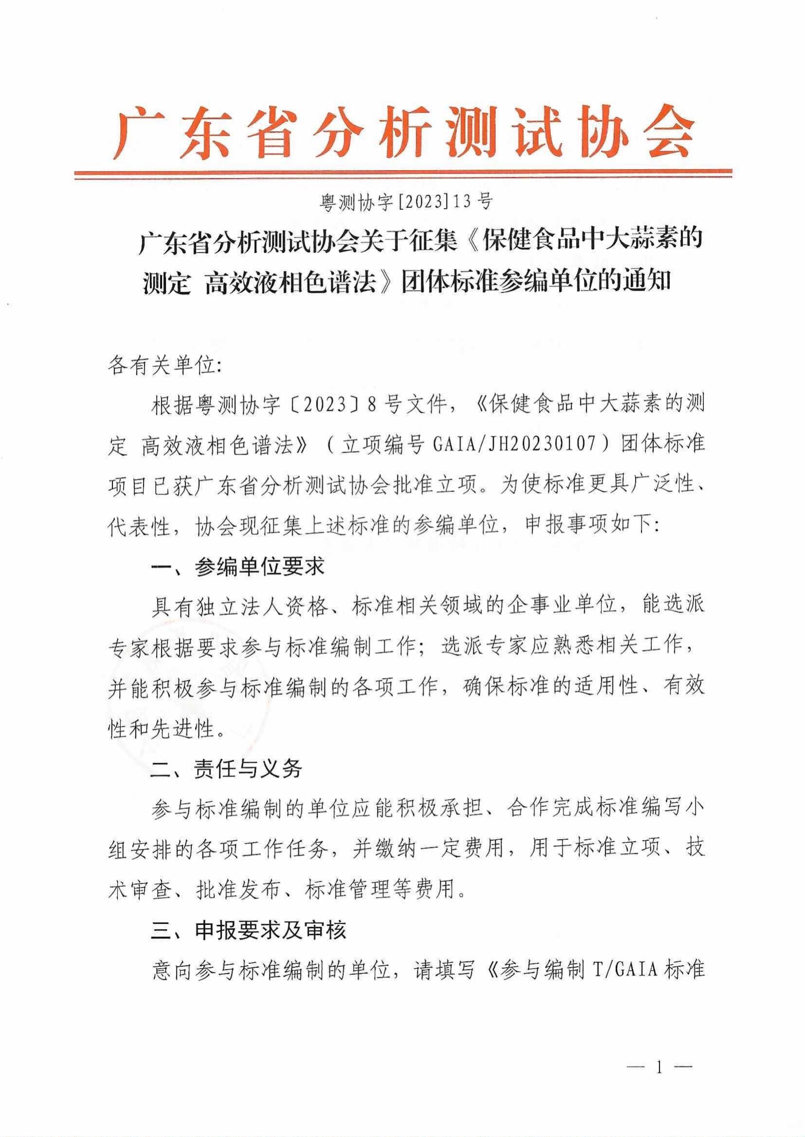 关于征集《保健食品中大蒜素的测定 高效液相色谱法》团体标准参编单位的通知