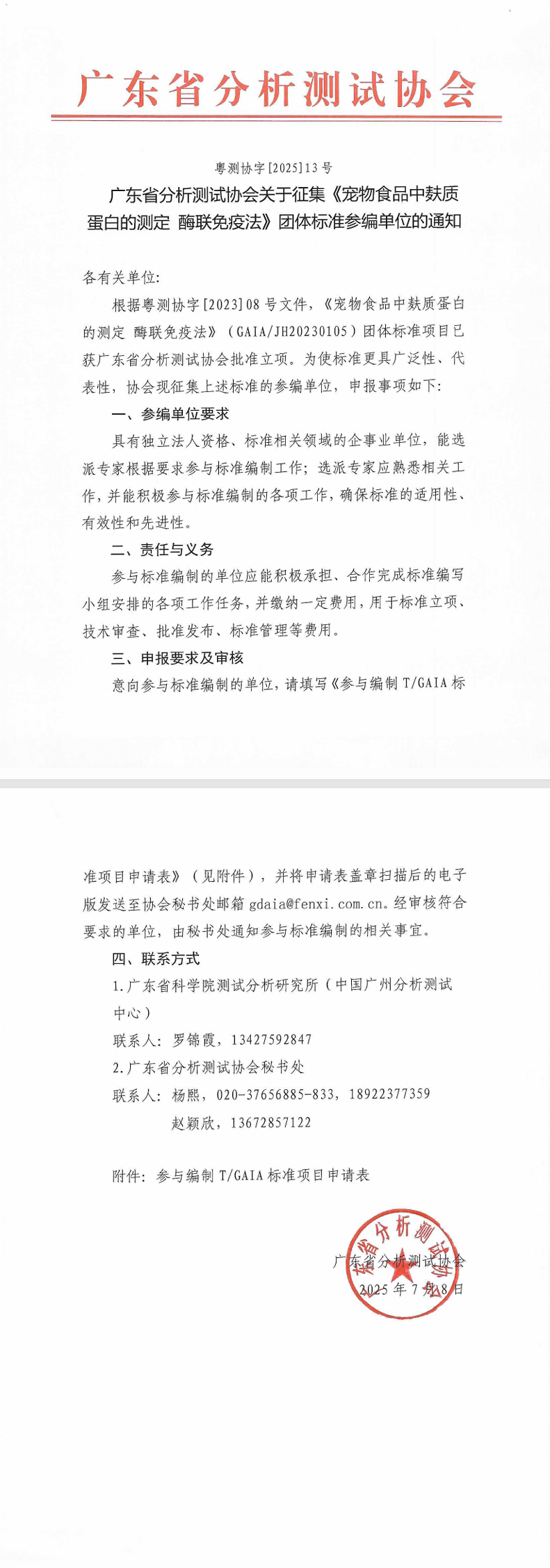 广东省分析测试协会关于征集《宠物食品中麸质蛋白的测定 酶联免疫法》团体标准参编单位的通知