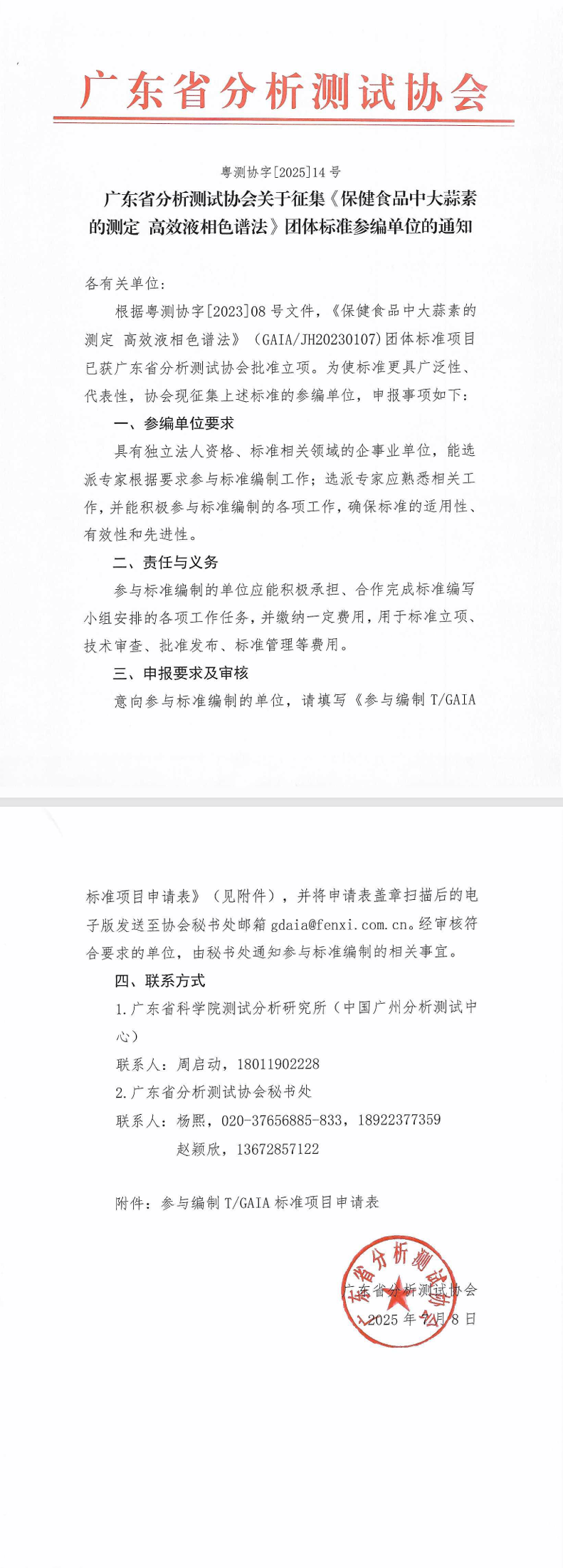 广东省分析测试协会关于征集《保健食品中大蒜素的测定 高效液相色谱法》团体标准参编单位的通知