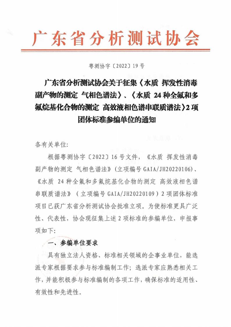 关于征集《水质 挥发性消毒副产物的测定 气相色谱法》、《水质 24种全氟和多氟烷基化合物的测定 高效液相色谱串联质谱法》2项团体标准参编单位的通知
